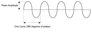 Several cycles of the wave are shown. One cycle is the portion of the wave that includes a positive peak and a negative peak, representing 360 degrees of phase relative to the starting point of the wave (the first positive peak of the wave is 90 degrees from the start and the first negative peak is 270 degrees from the start). The frequency of the wave is the inverse of the time between positive peaks (Hz = cycles per second). Phase can also be a relative measurement between two waves (in other words, one wave is the reference for the other). The figure below shows two waves of the same frequency that have the same amplitude. As you can see, there is a “zero” phase difference between them (their peaks line up). These waves are (you guessed it) “in phase.”