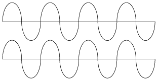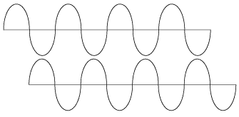 The next figure shows two waves where the peaks of one wave are lined up the valleys of the other. There is a 180 degree phase difference between them and they are, not surprisingly, said to be“out of phase.”